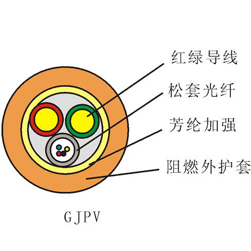 GJPV cable structure is the single mode or multimode fiber into a loose tube made of high modulus plastic, the casing filled with water blocking compounds. The loose tube and the signal wire are twisted to form a compact and round cable core, and the outer aramid fiber reinforced by the cable core is strengthened and the environmental protection and flame retardant PVC outer sheath is formed.